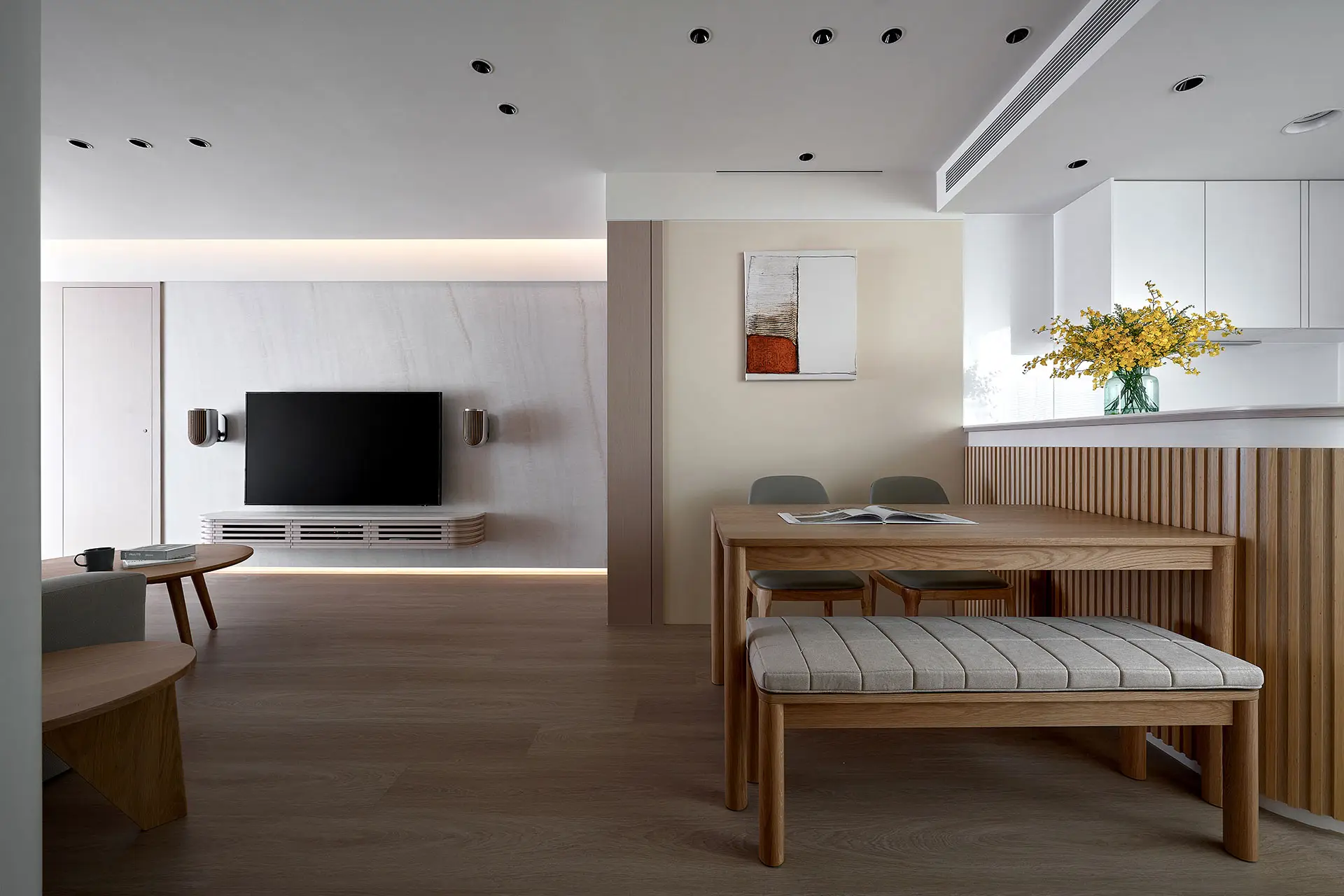 大面積木地板的應用,搭配淺色調家具,營造自然與現代交織的感官體驗。牆面與地板的材質過渡細膩,呈現出簡約卻不單調的空間語言。